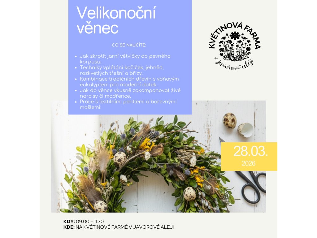 Objevte kouzlo velikonočních tradic a vytvořte si vlastní věneček, který bude symbolem jara, nového začátku a svěží energie. Na workshopu budeme pracovat s přírodními materiály, jarními větvičkami kočiček, sušenými květinami i jemnou tematickou výzdobou inspirovanou Velikonocemi.