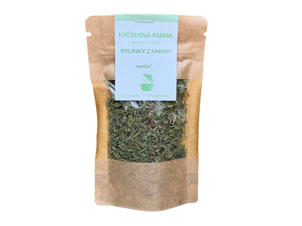 Tymián pěstujeme ekologicky, bez použití chemických hnojiv a pesticidů. Lístky a malé větvičky sbíráme ručně v období největší aromatičnosti a sušíme je šetrně, aby si zachovaly přirozenou chuť, vůni a cenné látky.