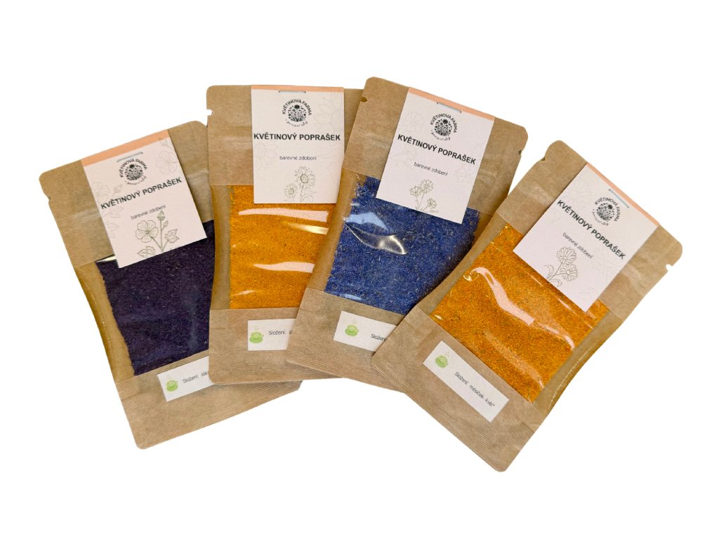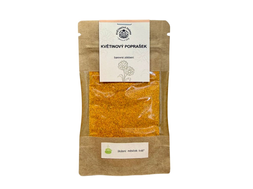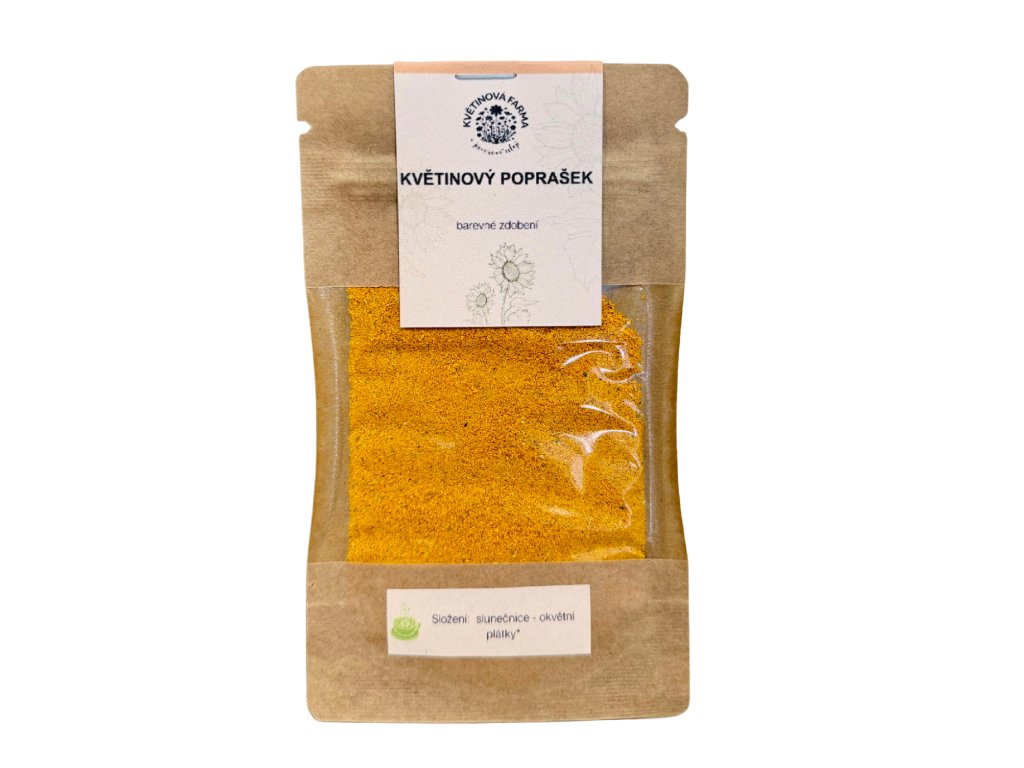 Jemný jako dech letního rána. Květinový prach ze slézu, z měsíčku, z chrpy, ze slunečnice, je okvětní plátek proměněný v barevný zázrak. Zdobí s lehkostí – mléčnou pěnu na kávě, dezerty, talíře pro slavnostní příležitosti.