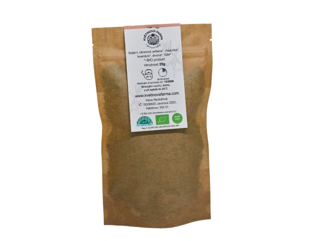 Tato harmonická směs přináší dokonalou kombinaci vůní a účinků pěti výjimečných rostlin. Obsahuje meduňku, citronovou verbenu, levanduli, diviznu a růži – všechny pěstované s láskou na naší ekologické farmě. Každý lístek a květ byl ručně sbírán a šetrně sušen, aby si uchoval svou přirozenou krásu a vůni.
