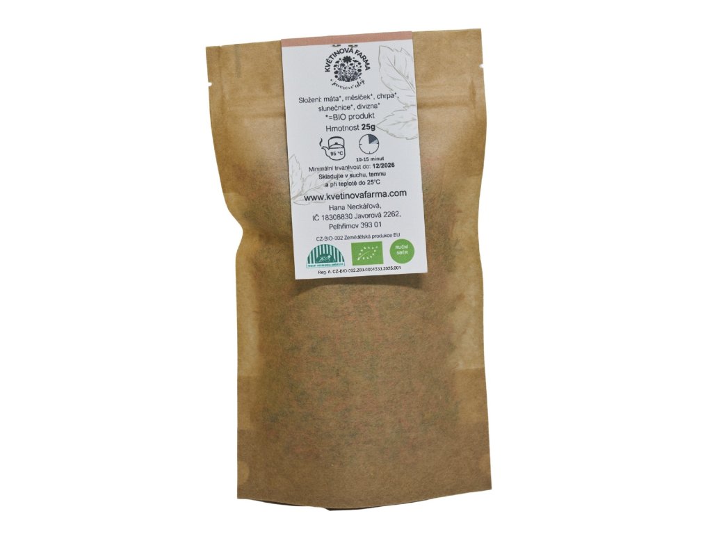 Tato harmonická směs mátových lístků a sušených květů měsíčku, chrpy, slunečnice a divizny přináší osvěžující aroma a nádherné barvy. Je ideální pro přípravu bylinných čajů, aromatických koupelí nebo jako přírodní dekorace. Každá složka byla pěstována s láskou na naší farmě, ručně sbírána a šetrně sušena.