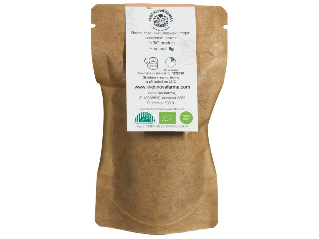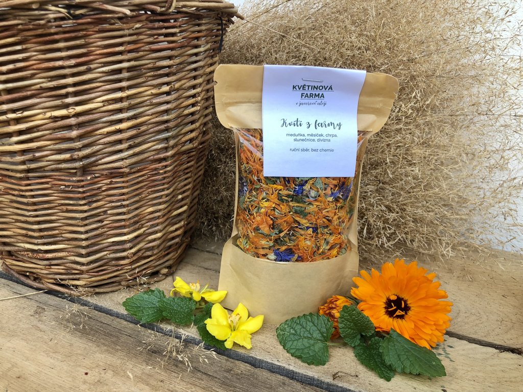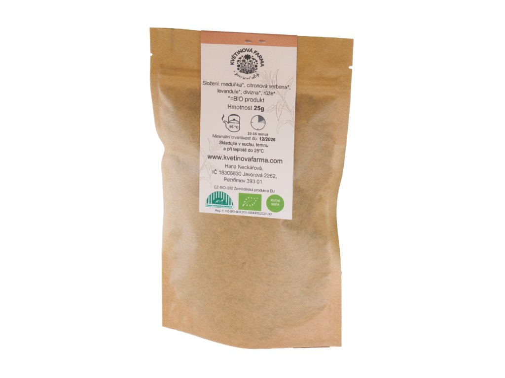 Tato pečlivě vybraná směs meduňkových lístků a sušených květů měsíčku, chrpy, slunečnice a divizny přináší harmonii chutí, vůní a barev. Je ideální pro přípravu čajů, relaxačních koupelí nebo jako dekorace, která rozzáří každý interiér. Všechny složky byly pěstovány ekologicky, ručně sbírány a šetrně sušeny, aby si uchovaly svou přirozenou kvalitu.
